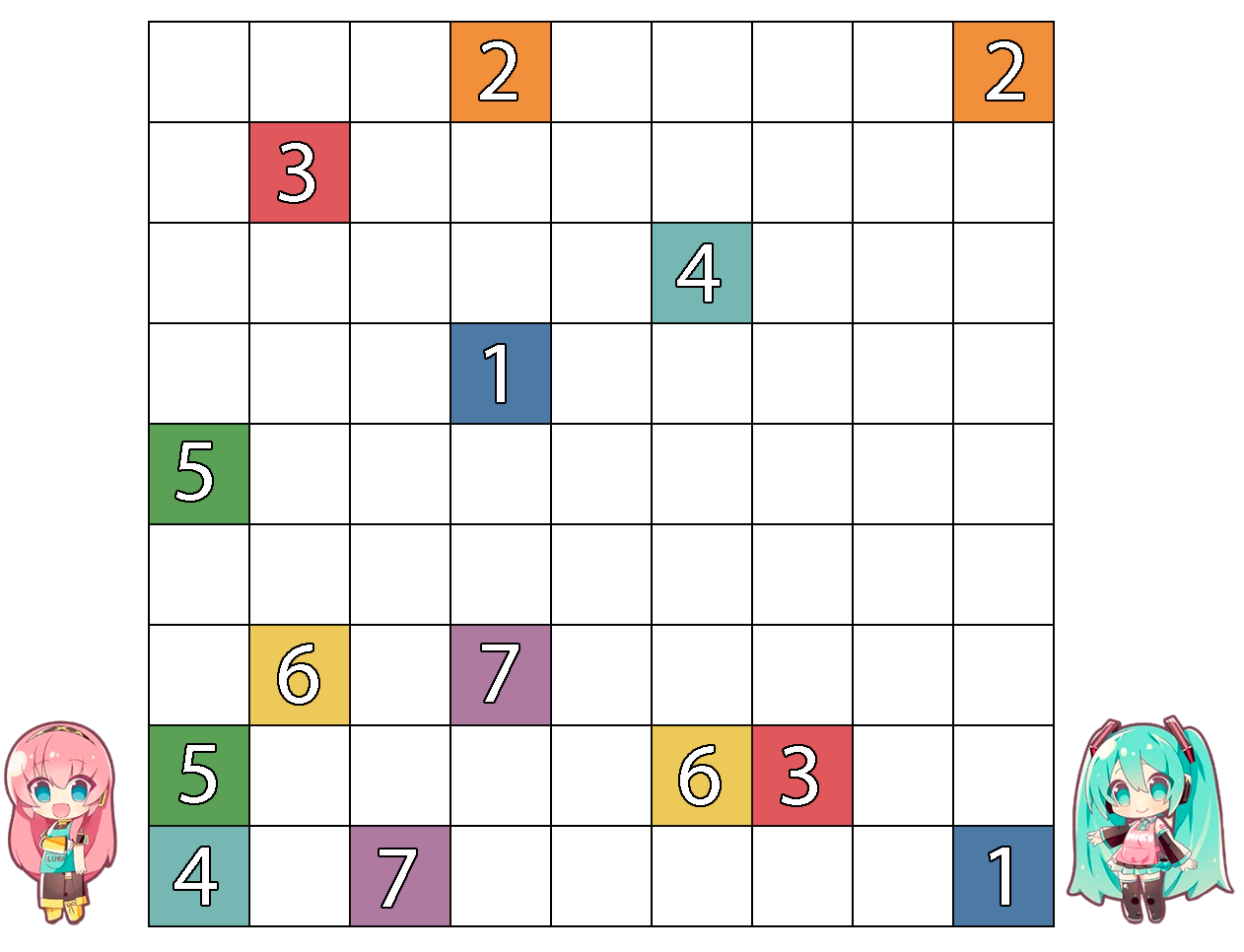 Our adapted version of Tamagotori is a connecting logic game similar to Numberlink or Arukone. The object of the game is to match each pair of eggs together in the grid, connecting each square until the grid is filled with unsplit lines. Here is a simpler puzzle as an example.