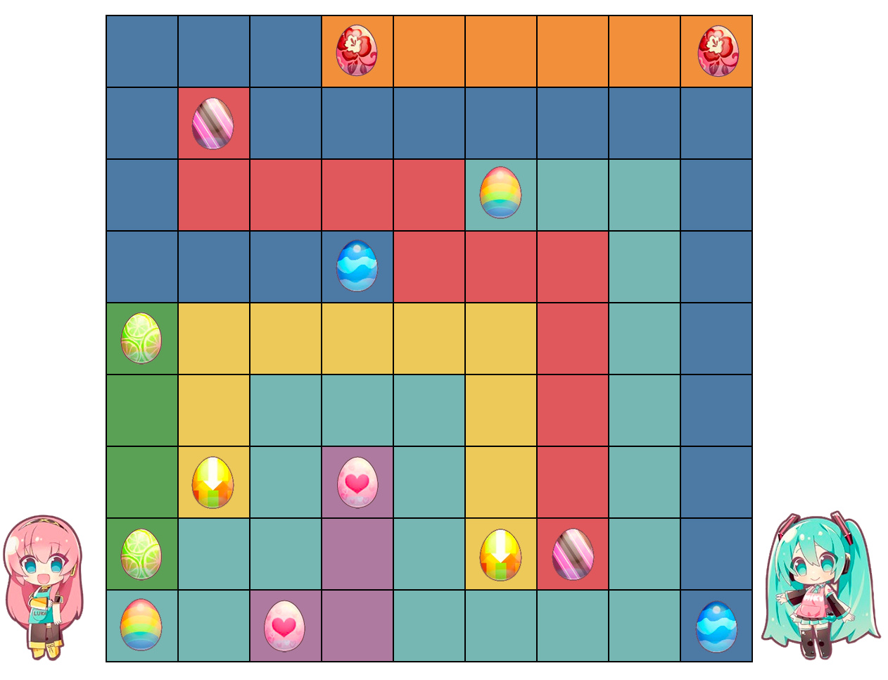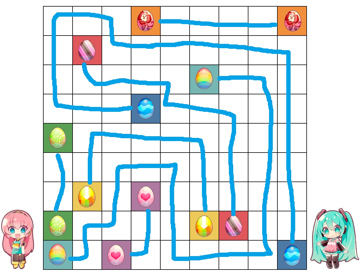 1. Each colored egg must be matched to its partner in the grid with an unbroken and unsplit path to hatch them.