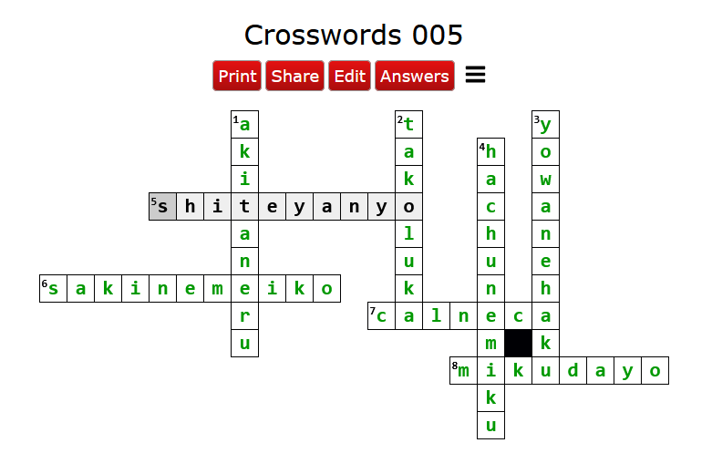 | ACROSS: 5. A mascot character based on Miku, but if her twintails were...legs? 6. A fanloid based on MEIKO, described as "the MEIKO who came into the music trend in the age of 16". 7. Despite her scary appearance, she's not a mean character. She appears in the song Saikin Osen - Bacterial Contamination -. 8. A mascot costume version of Miku based on her Nendroid figure. She appeared in fanmade parody commercials for 7 Eleven, and is known for being clumsy and having a bad personality. | DOWN: 1. A tsundere fanloid with yellow hair. She features in Triple Baka alongside Miku and Teto. 2. A super deformed mascot character based on Luka. She came into existence during the "Item War of Luka". 3. A moody and depressed fanloid created as a representation of unskilled Vocaloid users. 4. A super deformed mascot character based on Miku. All her stats are listed as "Error ⊂(゚Д゚)" |