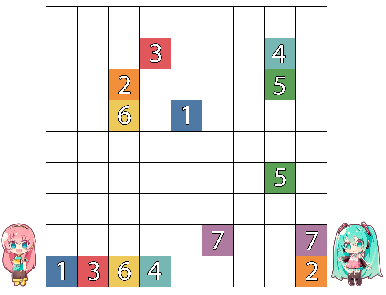 Our adapted version of Tamagotori is a connecting logic game similar to Numberlink or Arukone. The object of the game is to match each pair of eggs together in the grid, connecting each square until the grid is filled with unsplit lines. Here is a simpler puzzle as an example.