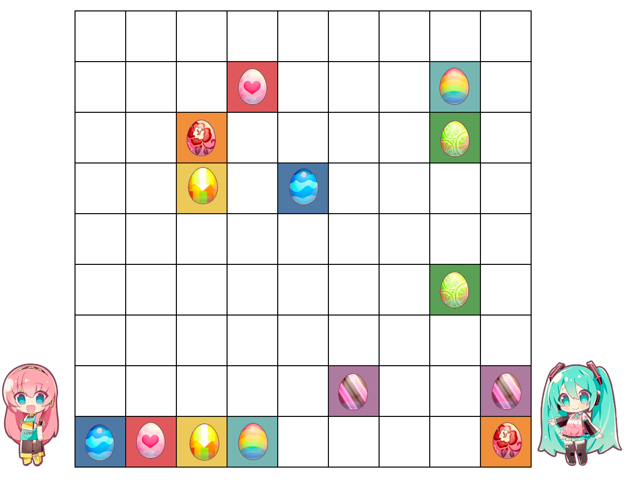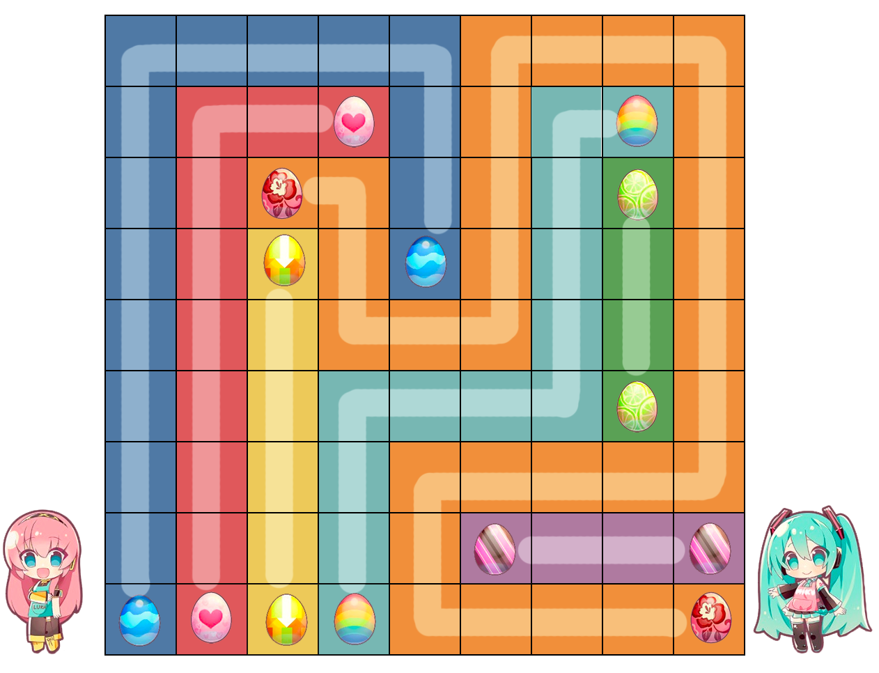 1. Each colored egg must be matched to its partner in the grid with an unbroken and unsplit path to hatch them.