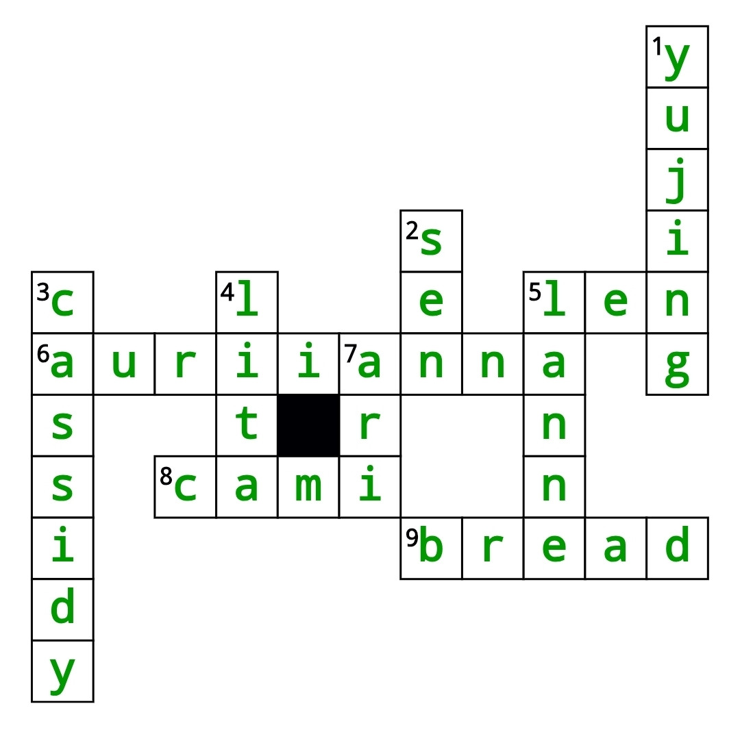 | ACROSS: 5. The first two decks this player mastered were lower and hatsunemiku25ji 6. Their member card features Senbonzakura Miku. 8. A player who created a very helpful tool for the Concert Hall game! 9. The first player to master campanella. | DOWN: 1. Currently the highest ranked player. 2. A player who joined in September with a blue member card. 3. A rank 1 player who joined on August 1st. 4. One of the owners of Module TCG. 5. Their trade site is hosted on mizuki.world and features art from Otome Kaibou. 7. A player with a rank in the double digits. They have 5 completed Aura Sheets, with Elegant being their Master aura. |