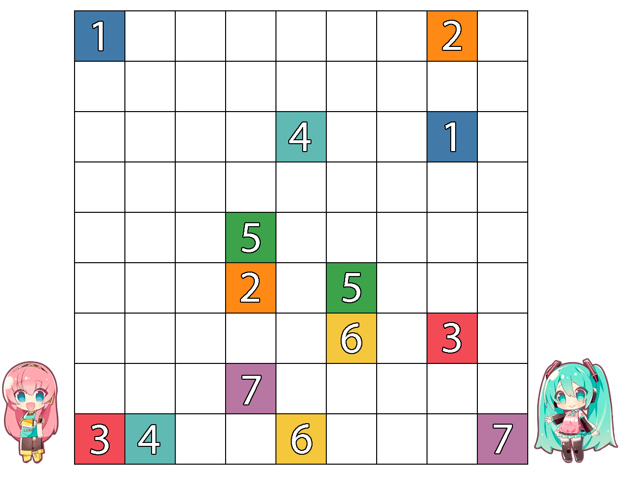 Our adapted version of Tamagotori is a connecting logic game similar to Numberlink or Arukone. The object of the game is to match each pair of eggs together in the grid, connecting each square until the grid is filled with unsplit lines. Here is a simpler puzzle as an example.