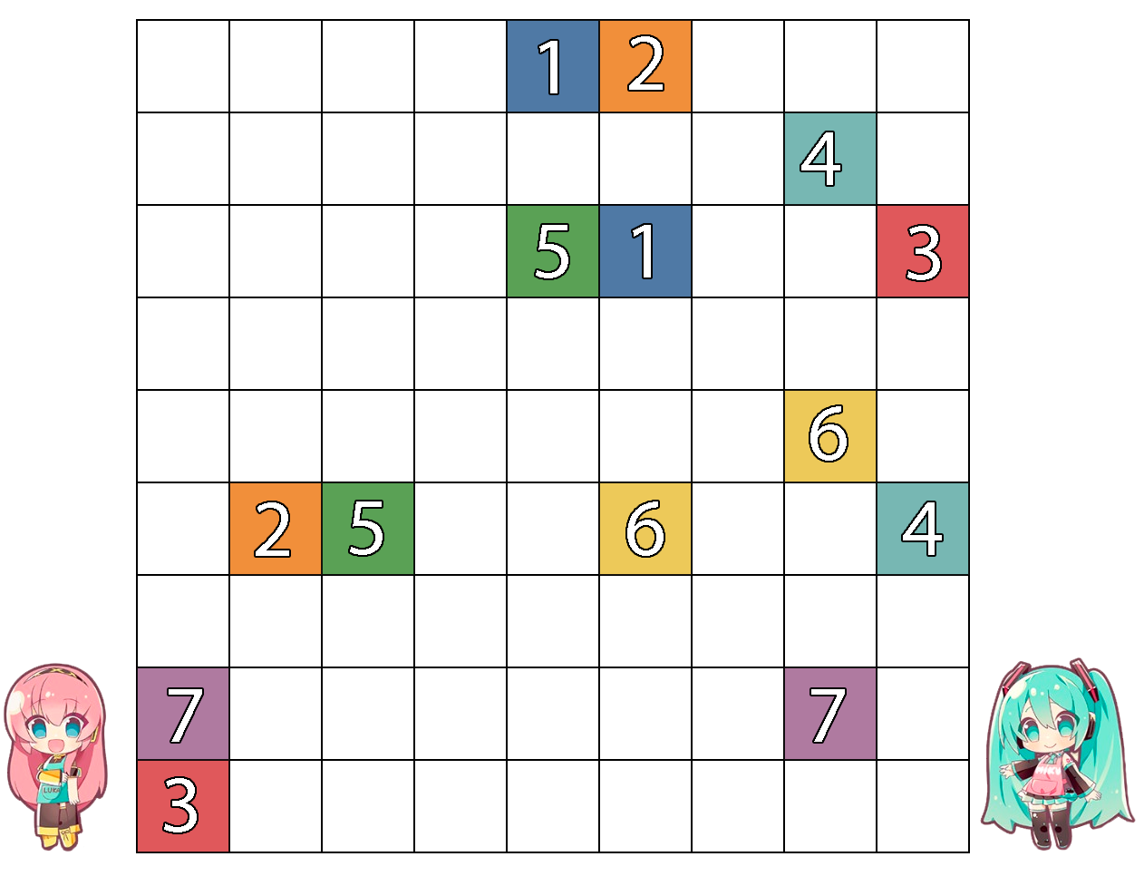 Our adapted version of Tamagotori is a connecting logic game similar to Numberlink or Arukone. The object of the game is to match each pair of eggs together in the grid, connecting each square until the grid is filled with unsplit lines. Here is a simpler puzzle as an example.