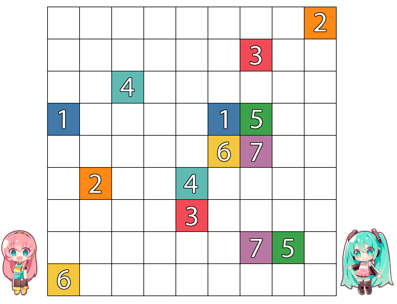 Our adapted version of Tamagotori is a connecting logic game similar to Numberlink or Arukone. The object of the game is to match each pair of eggs together in the grid, connecting each square until the grid is filled with unsplit lines. Here is a simpler puzzle as an example.