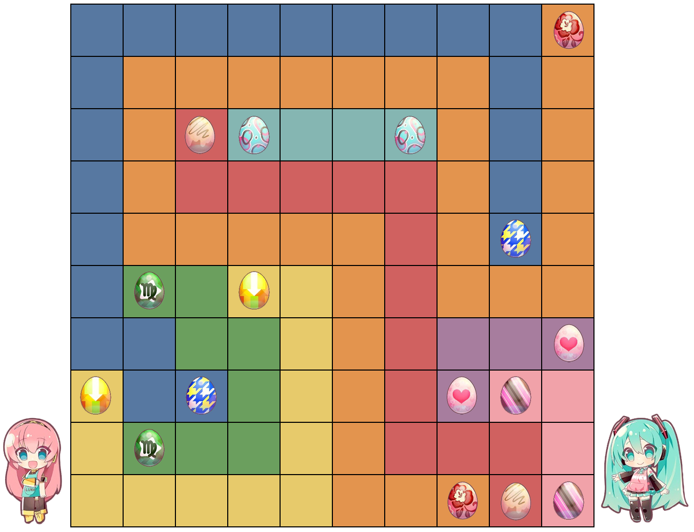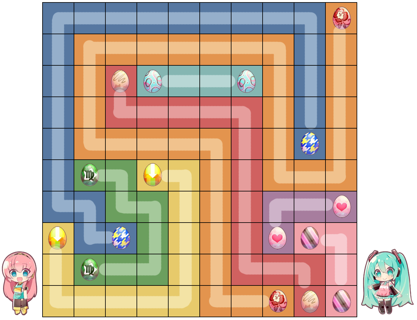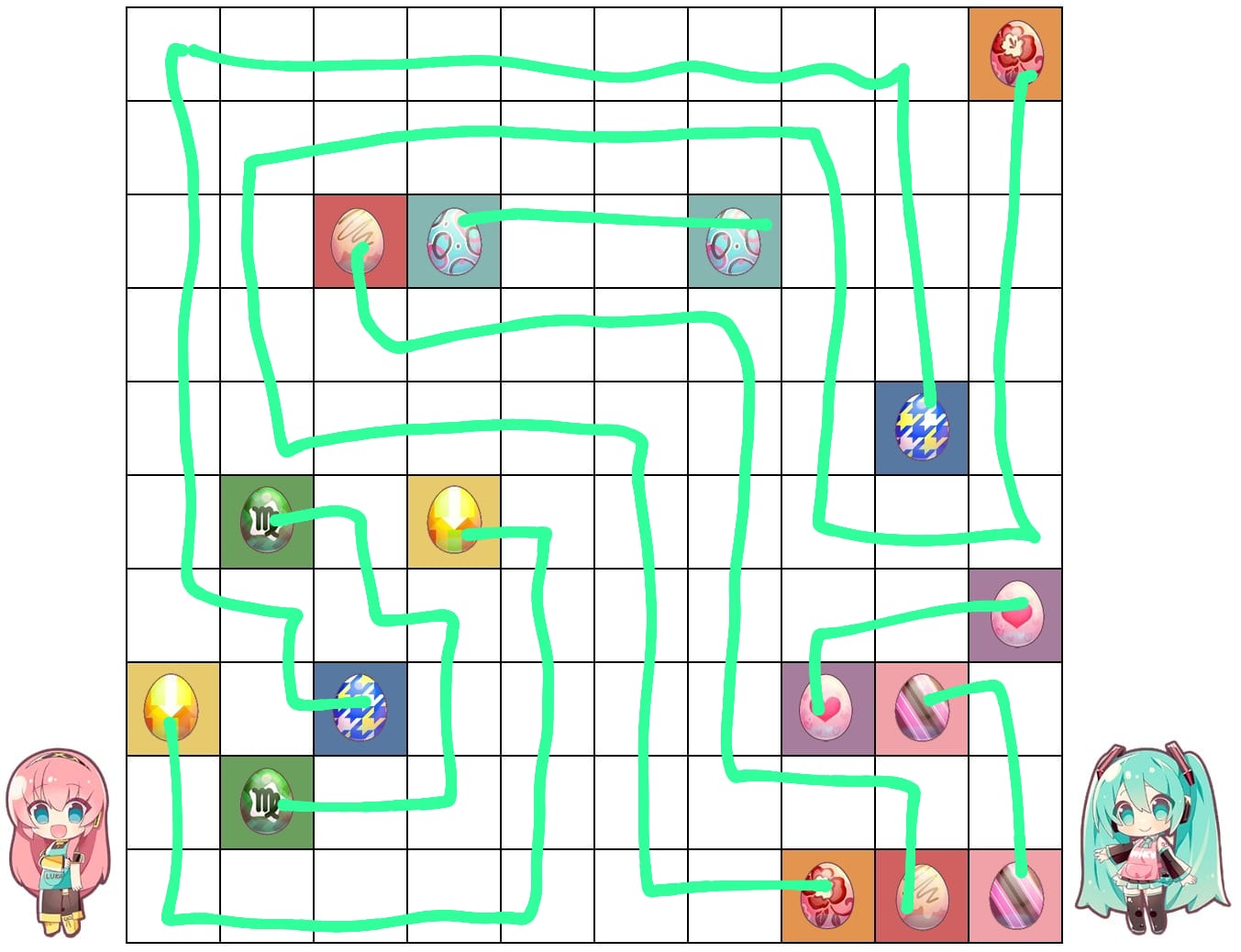 1. Each colored egg must be matched to its partner in the grid with an unbroken and unsplit path to hatch them.